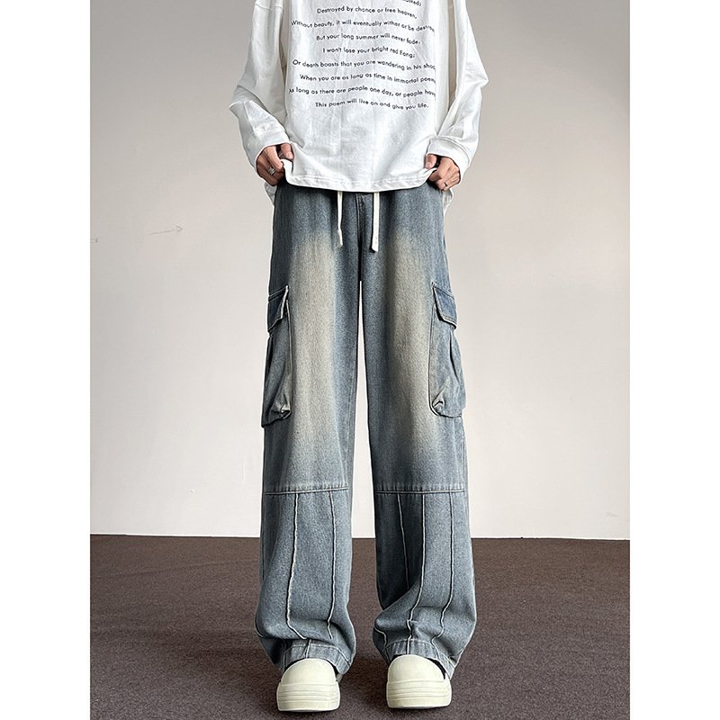 Embrace the grunge revival with these distinctive wide-leg, faded blue denim jeans. This piece stands out with its unique patchwork paneling and visible contrast stitching, adding a dimensional texture and an authentic vintage character. The distressed, washed finish gives the jeans a perfectly broken-in look and feel from day one. Designed with an extremely relaxed, baggy fit, they capture a bold, retro-inspired aesthetic ideal for urban settings. Paired with a simple white top and platform sneakers, these jeans are the perfect statement piece for those seeking comfortable streetwear with a rebellious edge.